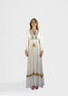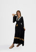 Black maxi dress with intricate mirror work and soft gold tassels. Cinched at the waist for a flattering shape and finished with vintage-style embroidery—ideal for summer soirées or beachside evenings.